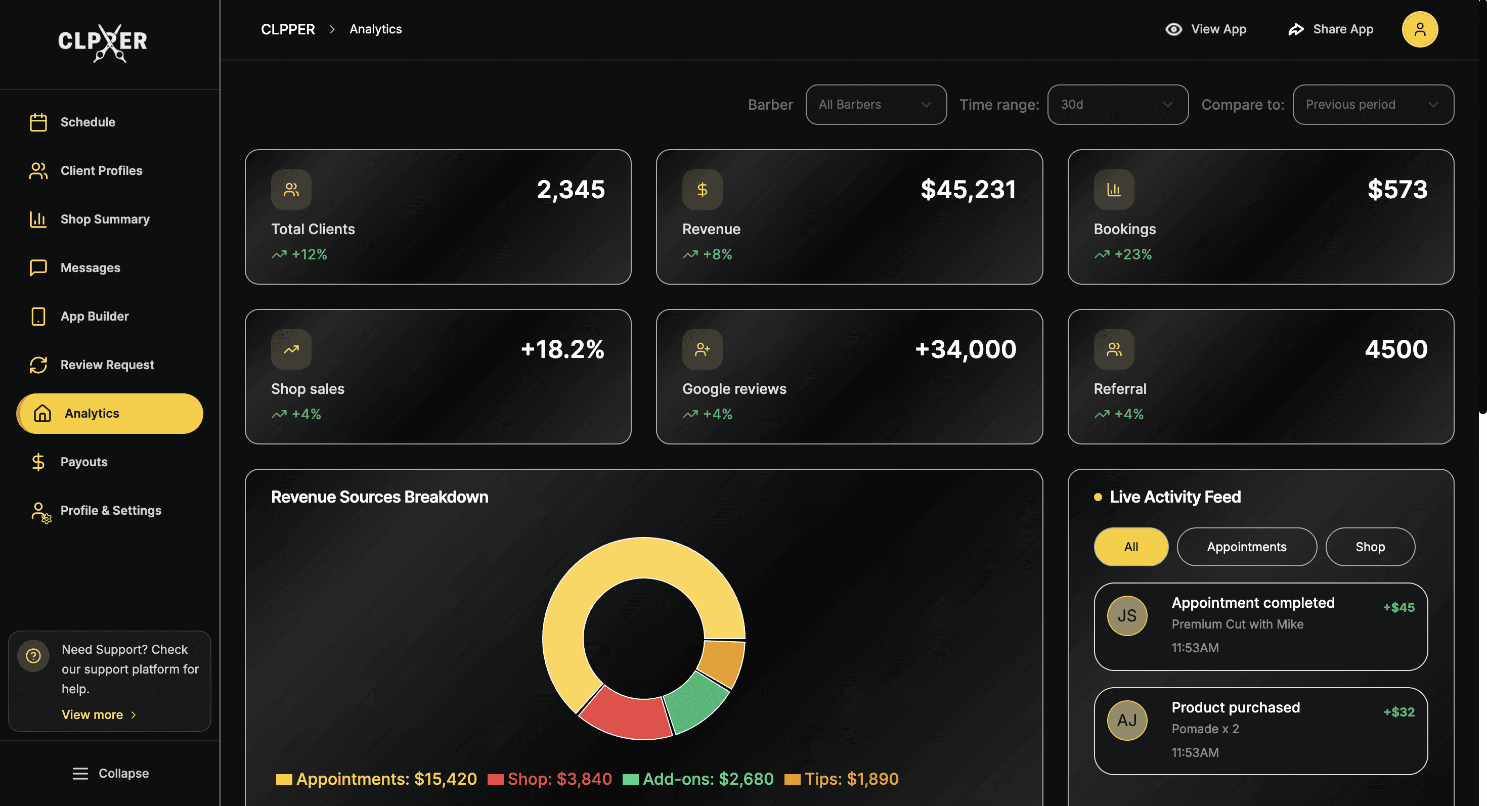 Your current booking app show your competitors. Clpper gives your shop a branded app only for your business. Clients book, buy products, message you, and leave reviews without seeing other barbers. You control the relationship and keep more revenue.